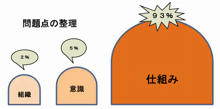 次に整理された問題点を「組織・意識・仕組み」の3つに分類します。この時、注意すべき点は、組織・意識の問題点は仕組みとして解決することができないかを重点的に考え、なるべく組織・意識の問題点は最小限に抑えることです。その目安としては、問題点の総数に対して組織が2%、意識が5%、仕組みが93%の割合です。