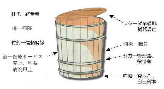 “樽は人間が生み出した最高の傑作”と言われます。この樽を弊社では「自己・役割・仕組み」に例え、それらを構成する要素の関係を立体的に分かりやすくし、樽式活性化法を考案いたしました。この樽式活性化法の最大の特徴は「百聞は一見に如かず」と言われるように、「自己・役割・仕組み」を樽という形で見ることで、その理解力が何倍、何十倍にもなることです。特に職員全員が樽という目に見えるものを通して、情報を共有化することが意識改革、仕組みづくりを進める上で大きな推進力になります。