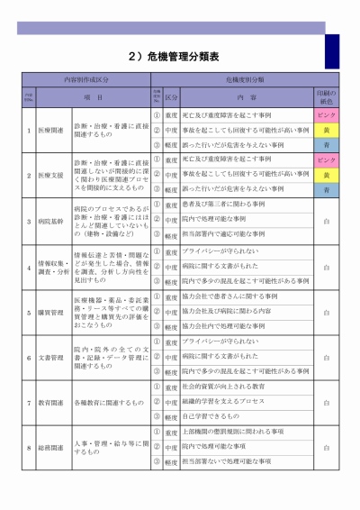 更に、この①~③のレベルを医療関連、医療支援、病院基幹、情報収集・調査・分析、購買管理、文書管理、教育関連、総務関連の8 つの区分に割り当て、特に重要度の高い医療関連、医療支援についての仕組みには、一目でそのレベルが分かるように、赤・黄・青の信号に見立てた紙色で、その危機管理度を明確化します。