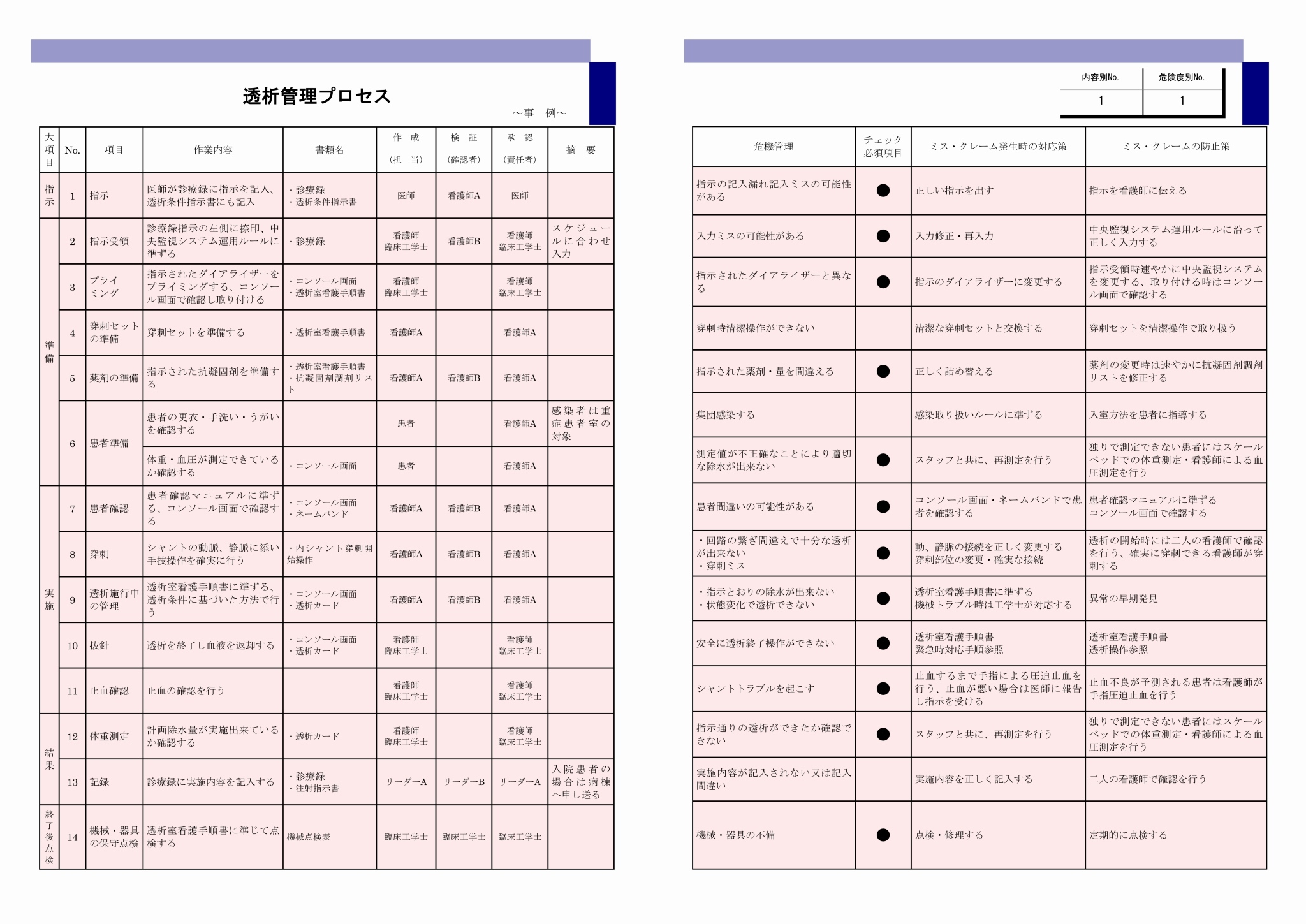 前表の「透析管理プロセス」にもあるように各管理システムには、「ミス・クレーム発生時の対応等」と「ミス・クレームの防止等」の欄を設けました。この欄には各プロセスで発生するミス・クレームに対してその対応策と防止策が書かれています。この欄は新人職員にとってどのプロセスでミス・クレームが発生するのか、その場合どう対応すべきなのかが明確となり、一番多く発生するという新人によるミス・クレームの発生防止に大きく役立っております。